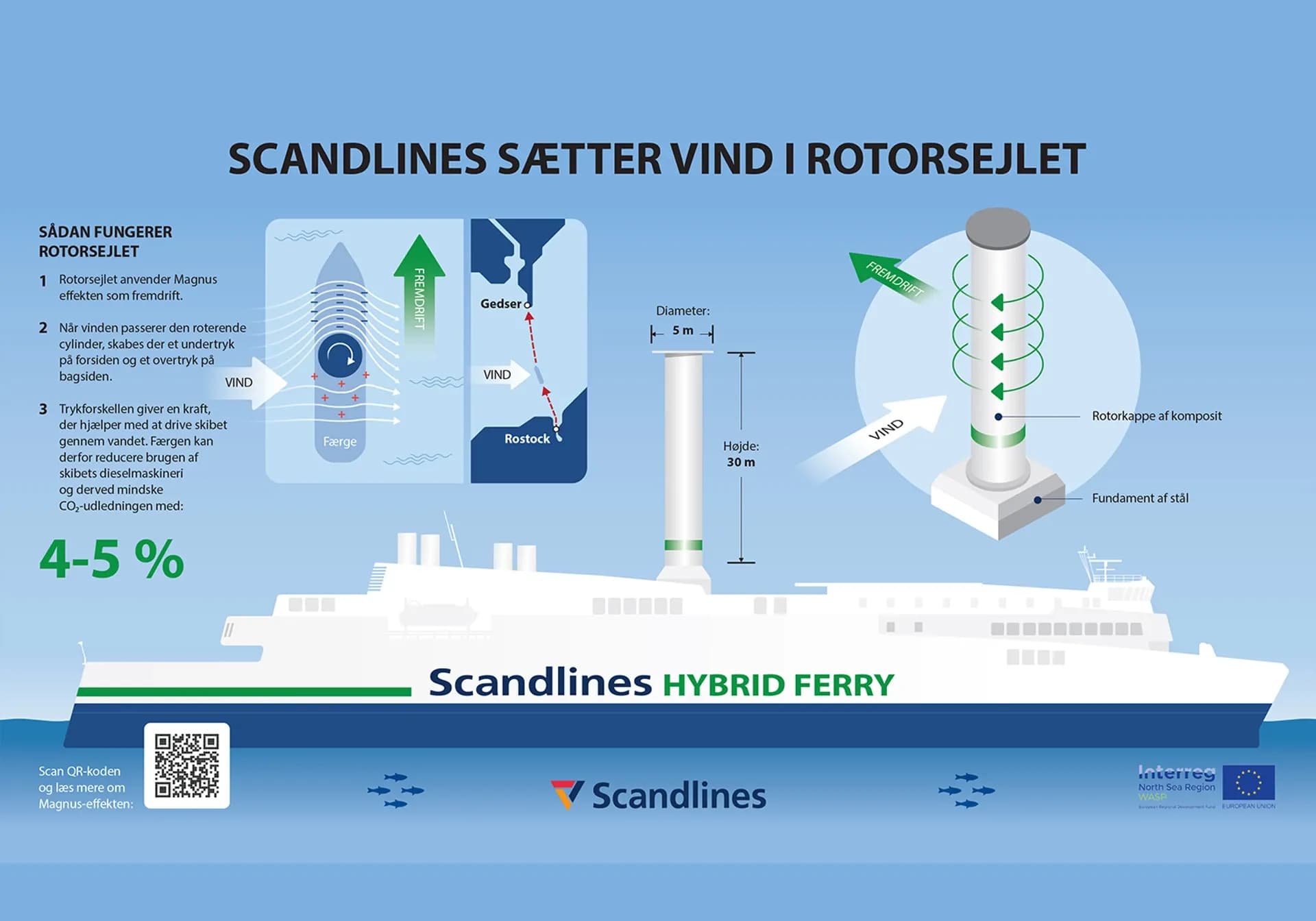 Siden 2013 har vi satset på færger med mindre emissionsintensiv hybridteknologi. I hhv. 2020 og 2022 installerede vi et rotorsejl på hybridfærgerne M/F Copenhagen og M/F Berlin, der sejler på ruten Gedser-Rostock. Med rotorsejlet fra finske Norsepower kan vi yderligere reducere CO2-udledningen fra hybridfærgerne. Norsepowers rotorsejlsløsning er den første maritime vindteknologi, der har vist sig at være konkurrencedygtig på kommercielle vilkår.