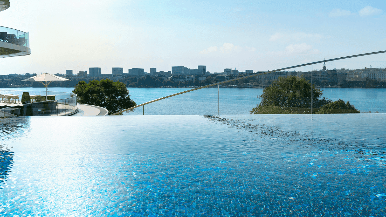 Hvad med en tur i poolen højt over Hamborgs tage? Netop det har du mulighed for i spaen på hotellet, The Fontenay, placeret lige ved Alstersøens bred.