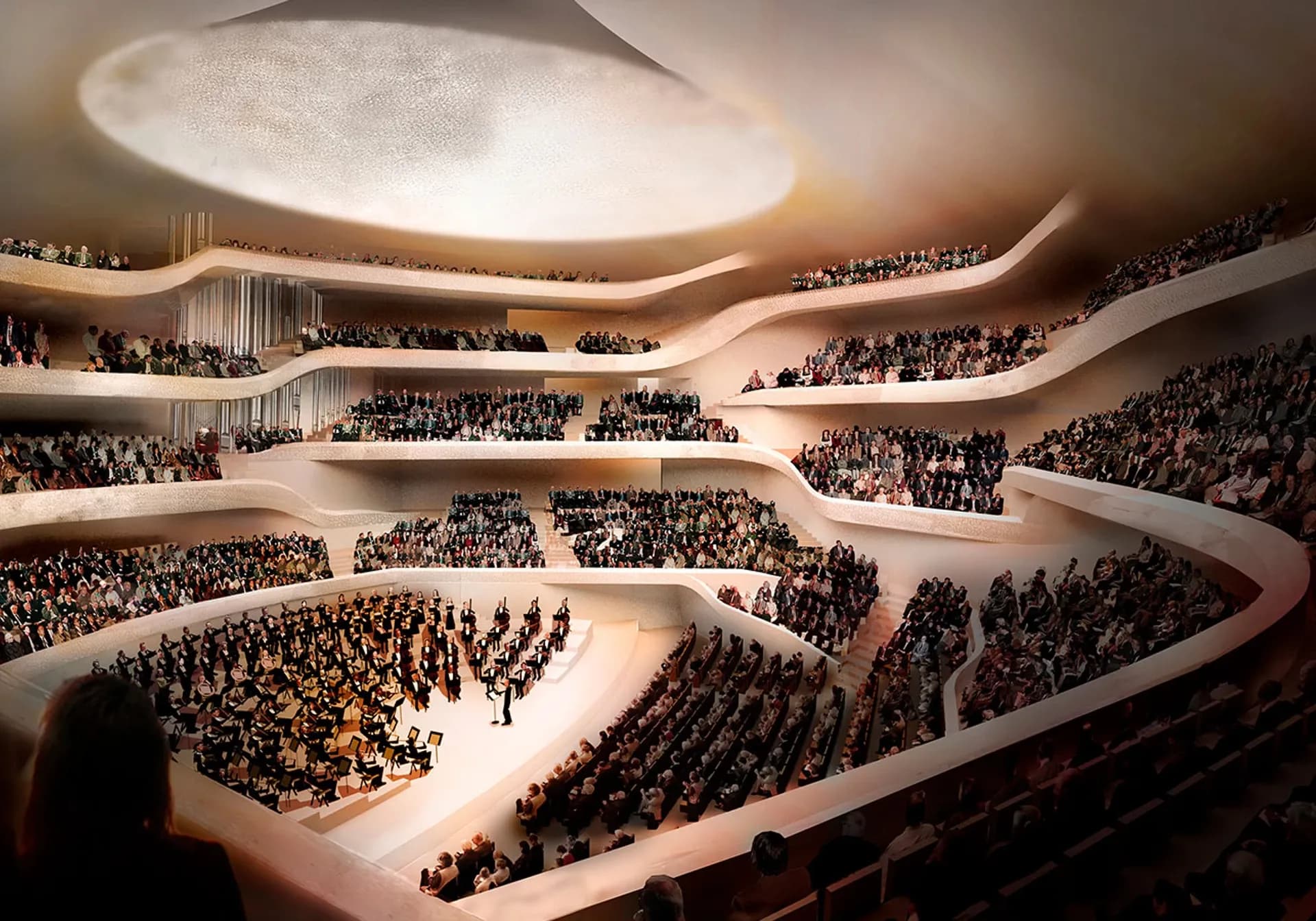 Det arkitektoniske vovestykke af et koncerthus har ikke overraskende sprængt alle økonomiske rammer. Udover tre koncertsale med den reneste lyd, rummer den imponerende bygning med det bølgende tag og den svungne glasfacade et luksushotel, restauranter, lejligheder, parkeringsanlæg og en offentlig tilgængelig udsigtsplatform med en 360 grader udsigt over byen og floden.