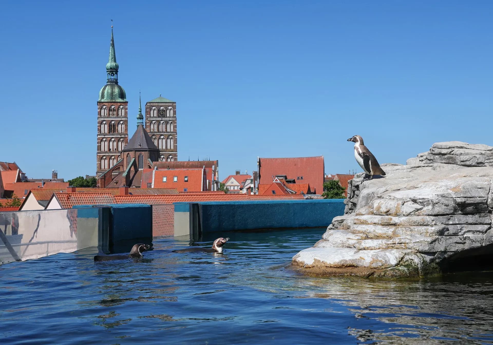 Man kan sige, at humboldt-pingvinerne lever lidt af et jetsetliv på toppen af akvariet. De er altid klædt på til fest i deres sort-hvide festdragt, de kan nyde deres 120.000 liter store private pool med tilhørende klipper og flotte udsigt over Stralsunds gamle by. Hver dag kan man se pingvinerne blive fodret.